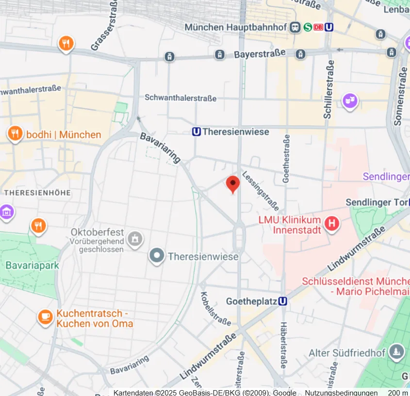 Unsere Praxis befindet sich zentral in München-Ludwigsvorstadt-Isarvorstadt, in der Herzog-Heinrich-Straße 6. Sie liegt nur wenige Gehminuten von der Theresienwiese und dem Bavariaring entfernt.